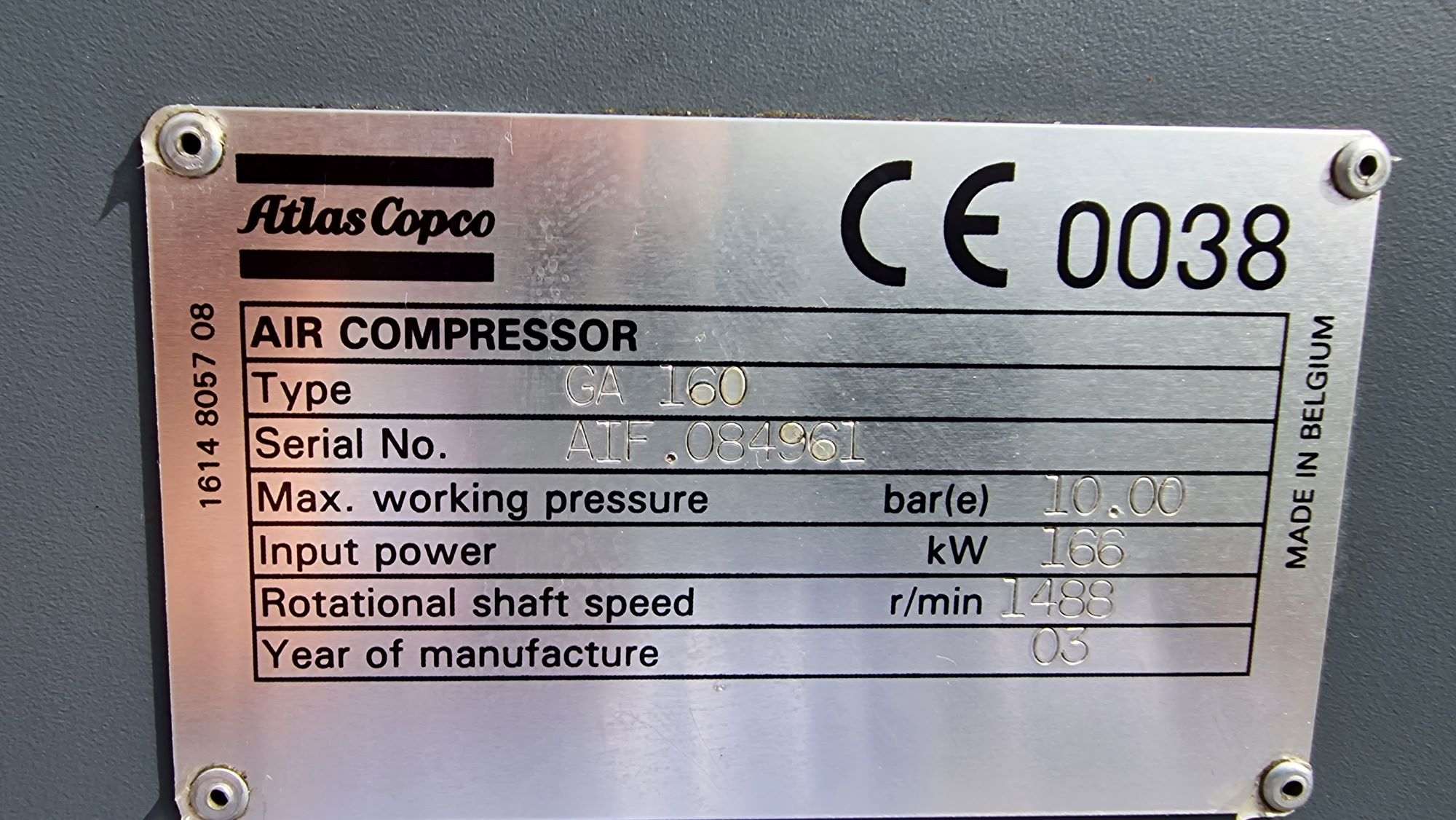 - Snaga 160 kW - Radni pritisak do 10 bara - Kapacitet 27,1 m3/min - Masa 3.440 kg - Priključak 2 1/2" - Godina proizvodnje 2003 - Serijski broj AIF 084961 - Ukupan broj radnih sati 7.900 Dimenzije Širina: 2.790 mm Dubina: 1.880 mm Visina: 2.020 mm