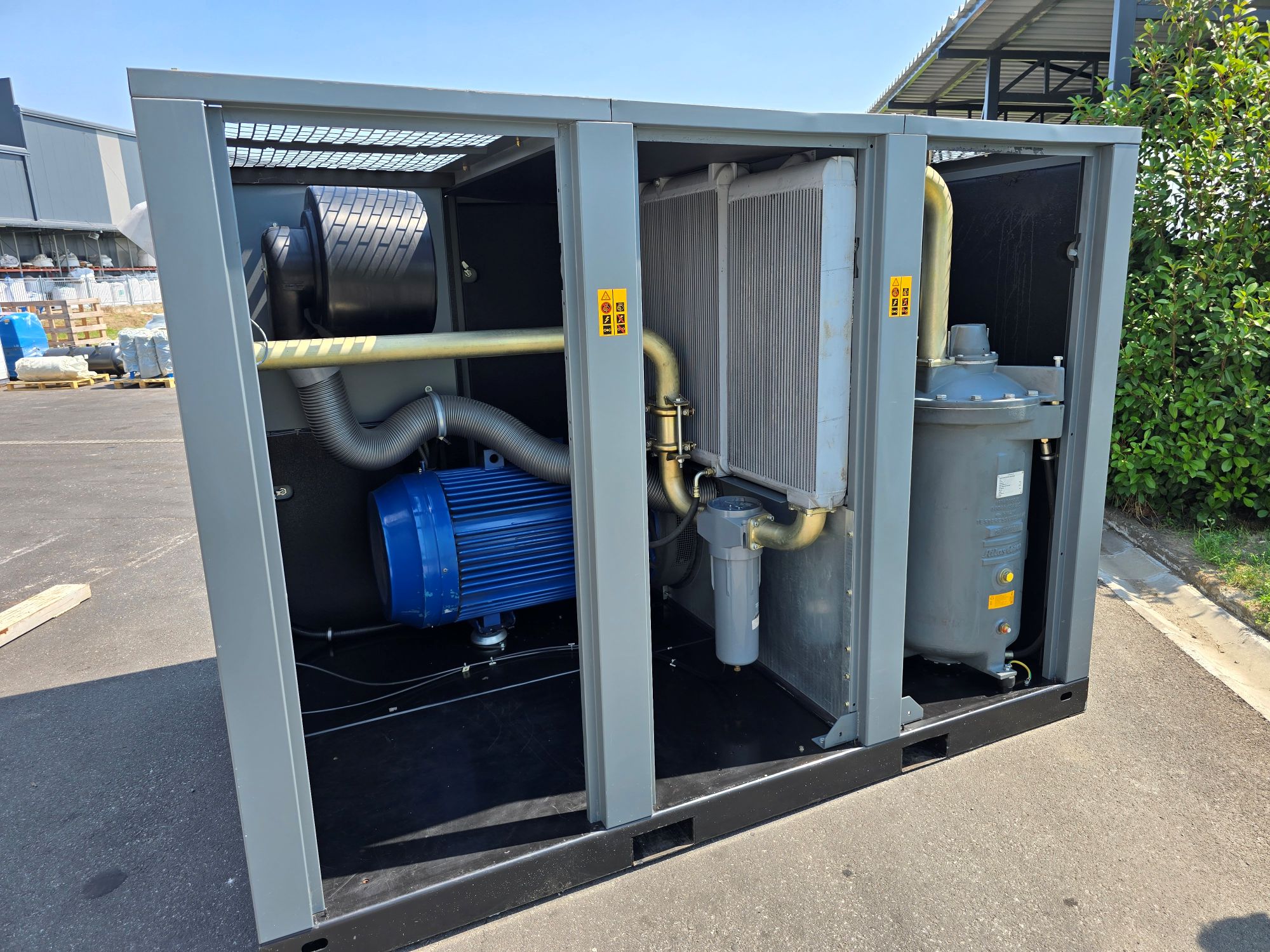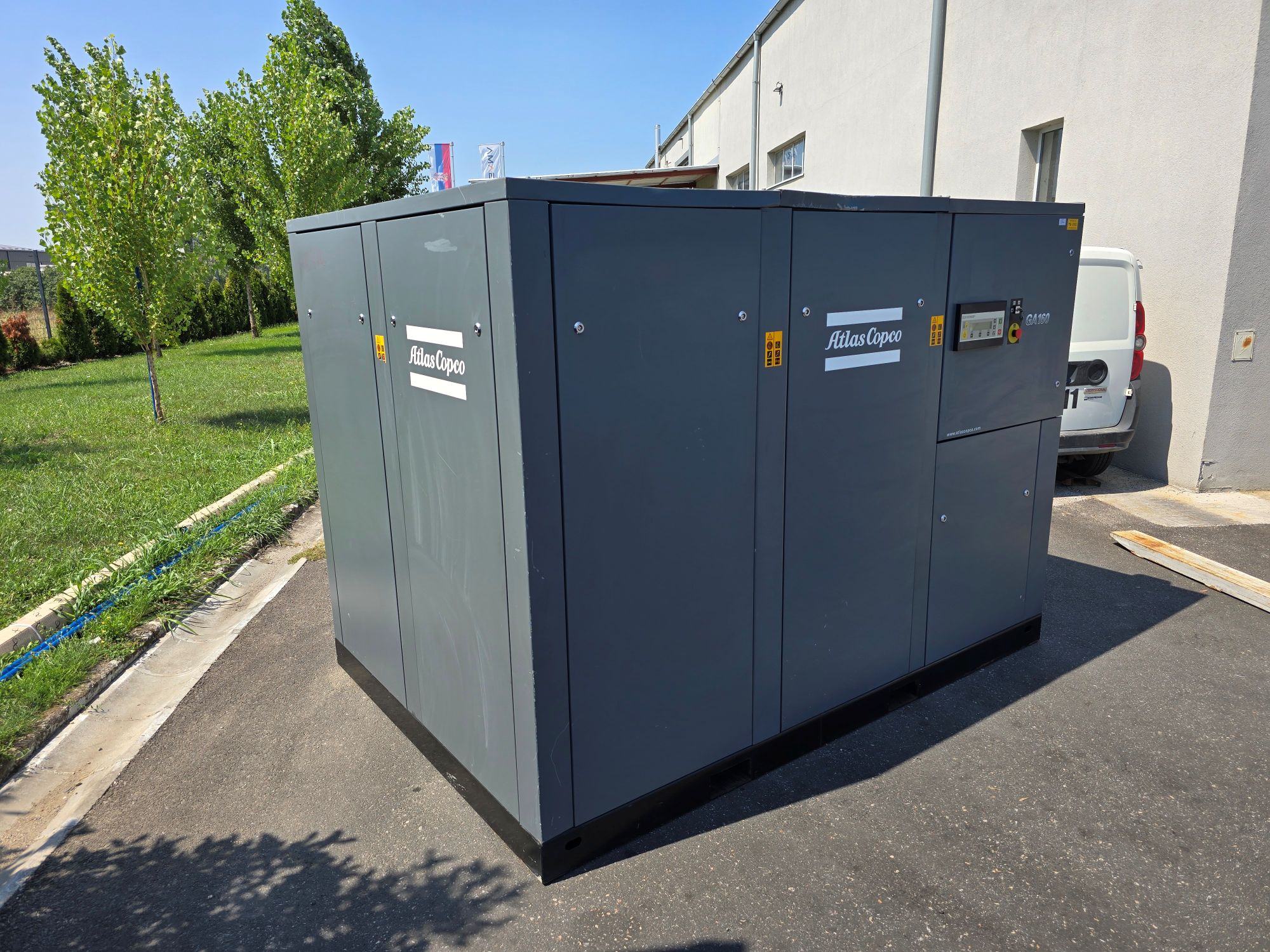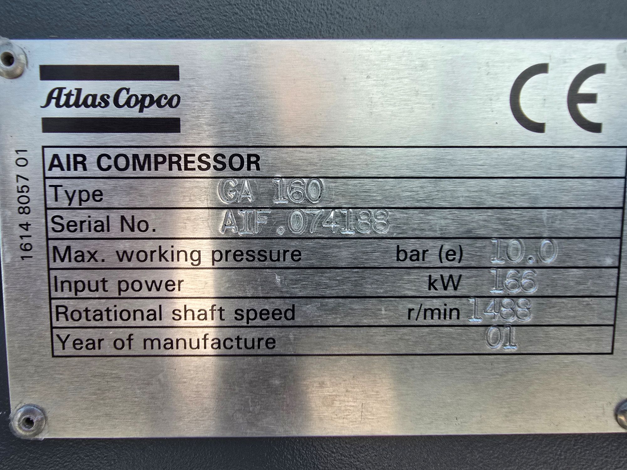 Proizvodjač Atlas Copco (Belgija) Snaga 160 kW Radni pritisak do 10 bara Kapacitet 24,54 m3/min Masa cca 3.440 kg Priključak 2 1/2 " Godina proizvodnje 2001 Okvirni broj radnih sati cca 12.500 Kontrola rada ELEKTRONICON Podmazivanje ULJNO Hlađenje VAZDUŠNO Integrisan rashladni sušač NE Frekventno regulisan rad NE