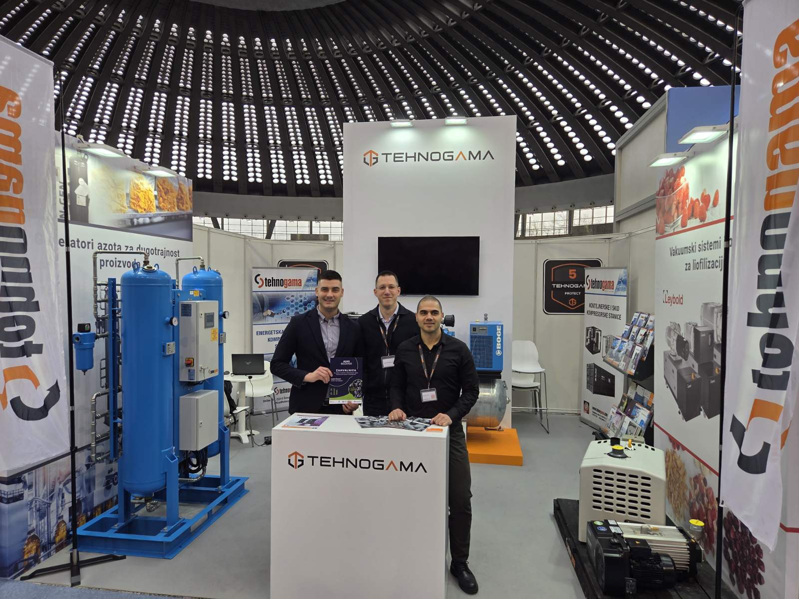Tehnogama je i ove godine zabeležila veoma uspešan nastup na sajmu Agro Belgrade 2026, jednoj od najznačajnijih regionalnih manifestacija koja okuplja proizvođače, distributere i stručnjake iz oblasti poljoprivrede, prehrambene industrije i pratećih tehnologija. Velika poseta našem štandu potvrdila je da tržište sve više prepoznaje značaj efikasnih i pouzdanih rešenja u oblasti komprimovanog vazduha, vakuuma i proizvodnje azota. 🌿 Omega Air – N-gen generatori azota Predstavili smo novu generaciju N-gen generatora azota kompanije Omega Air, namenjenih pouzdanoj i energetski efikasnoj proizvodnji azota direktno iz komprimovanog vazduha. Ovi sistemi obezbeđuju stabilan nivo čistoće, izuzetno niske operativne troškove i ekonomičan rad – idealni za prehrambeni sektor, pakovanje, skladištenje i druge agro-industrijske procese. ⚙️ Leybold – Clowac i Novadry vakuum pumpe Veliku pažnju posetilaca privukli su i vakuum sistemi renomiranog svetskog proizvođača Leybold, među kojima posebno izdvajamo: Clowac – suve „claw“ vakuum pumpe poznate po robusnoj konstrukciji, stabilnom radu i minimalnim troškovima eksploatacije. Novadry – inovativna generacija potpuno suvih vakuum pumpi bez ulja, idealna za prehrambenu industriju i okruženja koja zahtevaju visok nivo higijene i pouzdanosti. Obe serije su projektovane za dug radni vek, visoke performanse i rad u teškim industrijskim uslovima. 🔵 BOGE Kompressoren – C 15 LDR vijčani kompresor Naš štand je posebnu pažnju privukao predstavljanjem modela C 15 LDR kompanije Boge Kompressoren. Ovaj vijčani kompresor spaja kompaktnost, energetsku efikasnost i pouzdanost, a posebno se ističe stabilnim radnim karakteristikama i niskom bukom, što ga čini odličnim izborom za moderne proizvodne sisteme u agro i prehrambenom sektoru. 🌱 O značaju sajma Agro Belgrade Sajam Agro Belgrade postao je ključna regionalna platforma za predstavnike poljoprivrede i prehrambene industrije, kao i za sve kompanije koje nude tehnološka rešenja za ove sektore. Manifestacija svake godine okuplja vodeće proizvođače, prerađivače, dobavljače opreme i stručnjake, što je čini idealnim mestom za razmenu znanja, prezentaciju inovacija i uspostavljanje novih poslovnih kontakata. Za Tehnogamu, učešće na tomto sajmu ima strateški značaj jer direktno povezuje našu tehnologiju sa potrebama agro-industrije koja ubrzano raste i modernizuje se. 🔶 Zahvalnost partnerima i posetiocima Zahvaljujemo se svim posetiocima, partnerima i saradnicima koji su nas posetili tokom sajma. Vaše interesovanje i povratne informacije dodatno nas motivišu da nastavimo da razvijamo tržište i uvodimo napredna rešenja iz oblasti komprimovanog vazduha i vakuuma. Vidimo se i sledeće godine na još većem i uspešnijem Agro Belgrade sajmu!